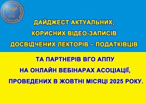 Дайджест відеозаписів актуальних, корисних виступів досвідчених лекторів – податківців та партнерів ВГО АППУ на онлайн Вебінарах Асоціації, проведених в жовтні місяці 2025 року.
